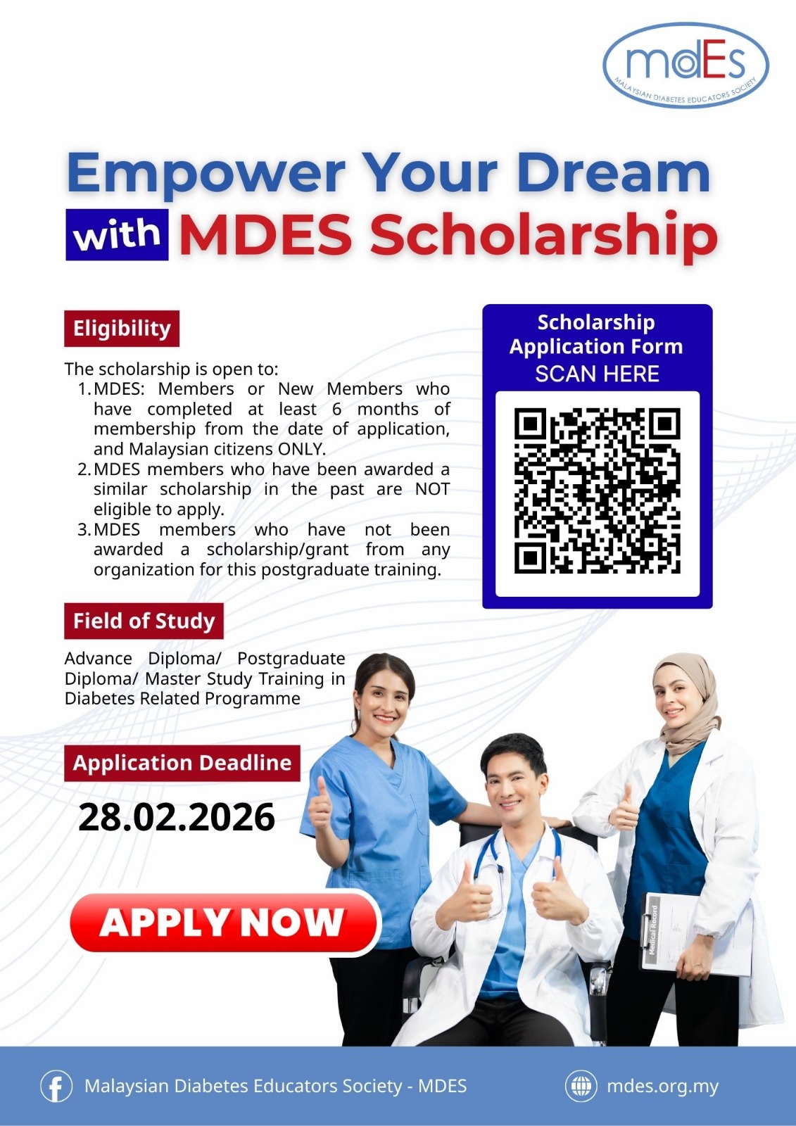 🎓 Malaysian Diabetes Educators Society (MDES) Scholarship Is Open! Dreaming of advancing your career in diabetes education?💙 MDES empowers your dream as a diabetes educator by supporting your studies for an Advanced Diploma, Postgraduate Diploma, or Master’s in diabetes-related programmes. ✅ Open to MDES members or new members (minimum 6 months membership at the time of application)✅ Malaysian citizens only❌ Previous MDES scholarship recipients not eligible❌ Applicants must not be receiving any other scholarship or grant for the same postgraduate training 📅 Application Deadline: 28 February 2026 📄 Apply here:🔗Application Form: https://mdes.org.my/wp-content/uploads/2026/02/SCHOLARSHIP-APPLICATION-FORM.pdf🔗Scholarship Process Guide: https://mdes.org.my/wp-content/uploads/2026/02/SCHOLARSHIP-PROCESS-GUIDE.pdf 📩 Enquiries: mdes0507@gmail.com Take the next step in your diabetes education journey 💙